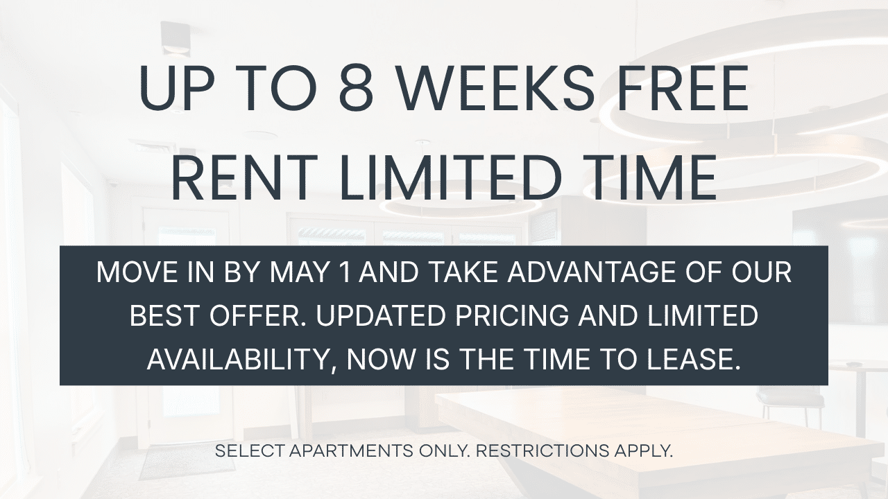 Now offering up to 8 weeks free on select apartment homes. Move in by May 1 for maximum savings.